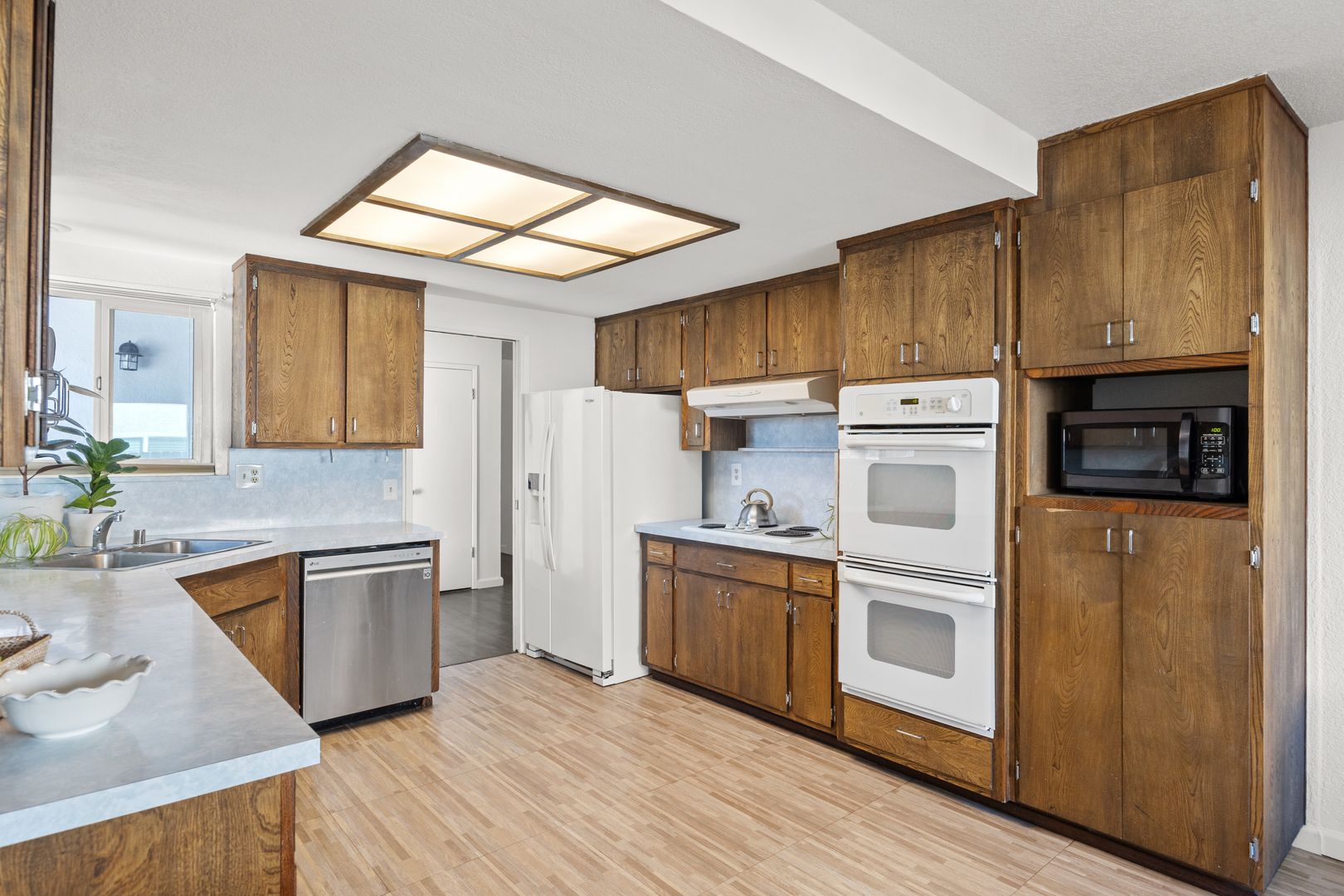 Enjoy a fenced front yard with mature shade trees, plus both front and back patios perfect for relaxing or entertaining. Inside, the sunken living room creates a cozy atmosphere, while the kitchen and dining areas flow easily for everyday living. The spacious covered back patio and low-maintenance turf backyard make outdoor enjoyment simple year-round.