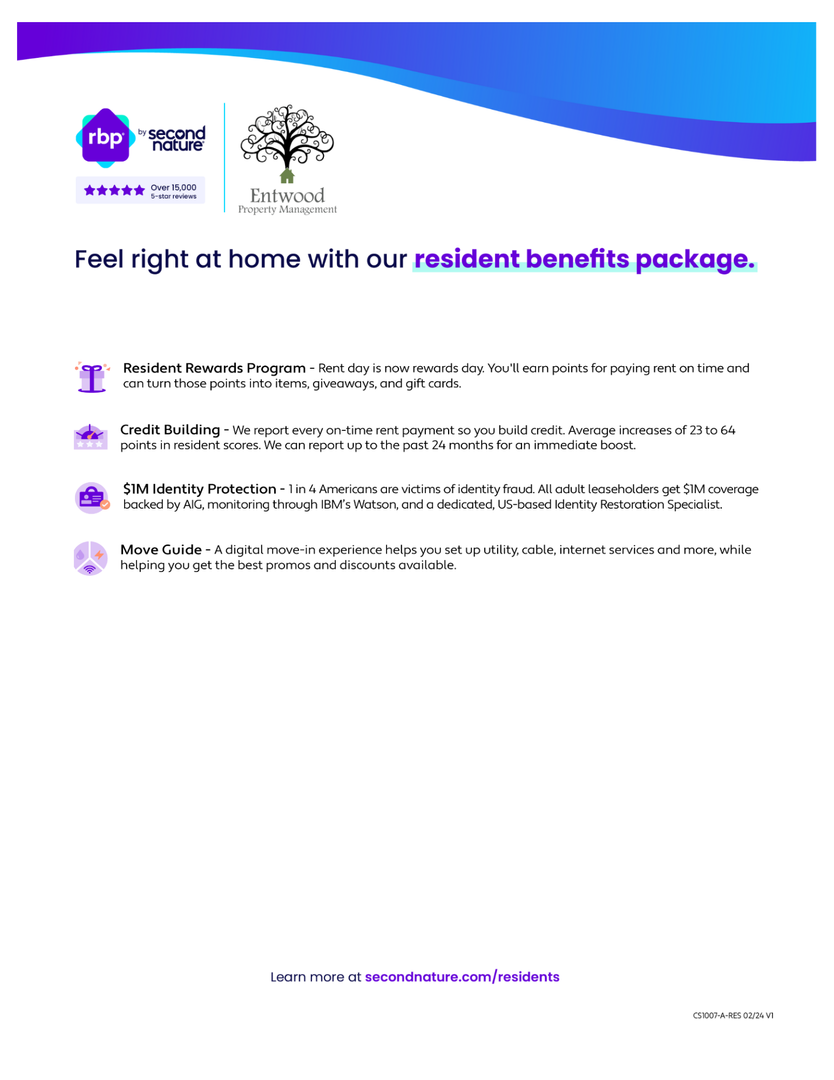 At Entwood Property Management Inc, we strive to provide an experience that is cost-effective and convenient. That’s why we provide a Resident Benefits Package (RBP) to address common headaches for our residents and provide must-have services for our renters. The Monthly Price of $22.50 includes utility setup assistance, credit building, and rewards program. In addition to RBP, we provide access to a property damage liability program that meets your needs. This cost is in addition to the property's monthly rent. More details upon application or on our website at www.entwoodpropertymanagement.com/rbp