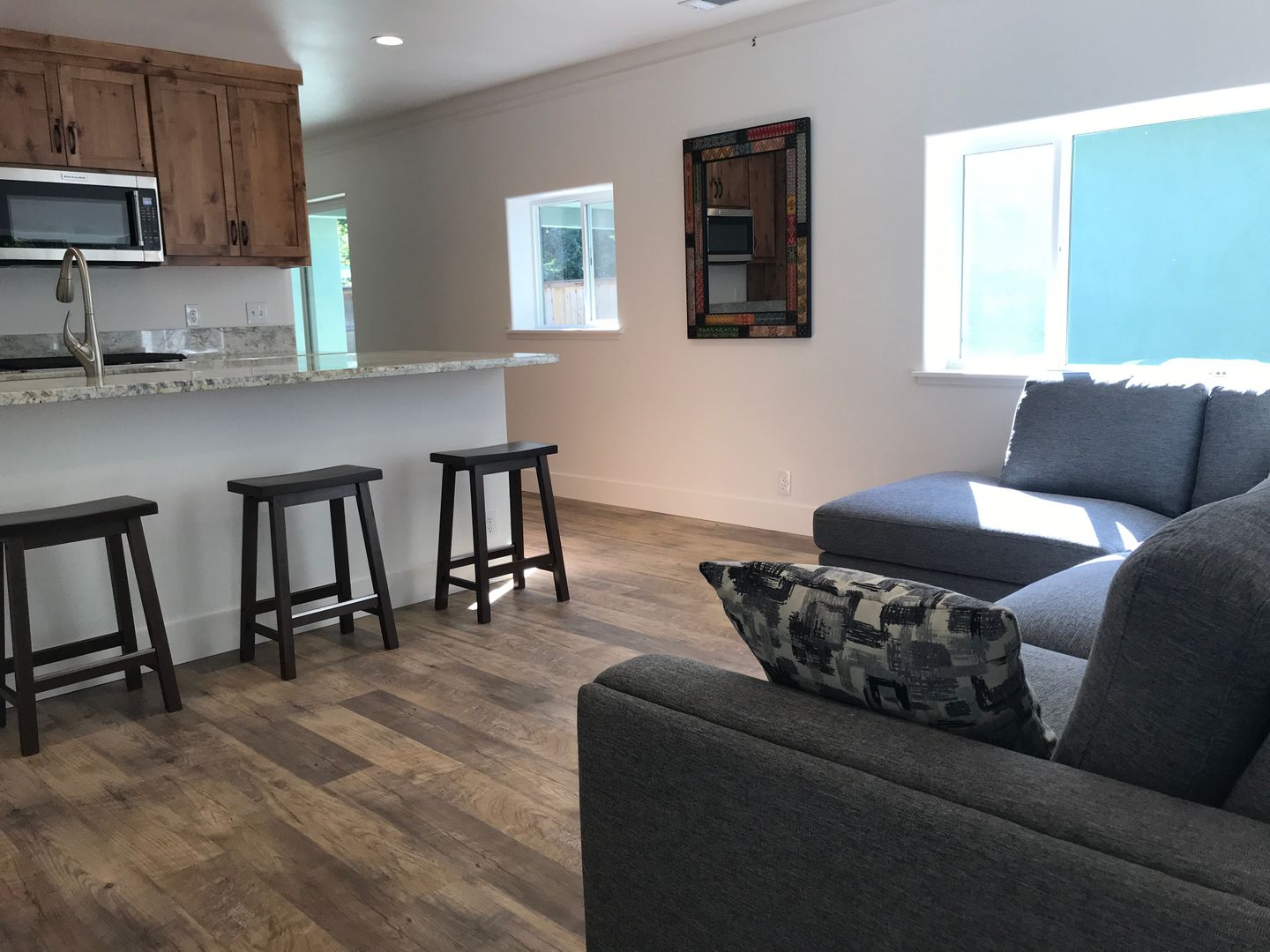 Both sides offering a completely different layout and style. The right side duplex is a two-story charmer with 5 rooms total. The furnished living space includes a TV and breakfast bar stools. A sleek modern kitchen can be used to bring dinner out to your covered outdoor patio! The patio is complete with spacious picnic table and Gas BBQ perfect for summer!